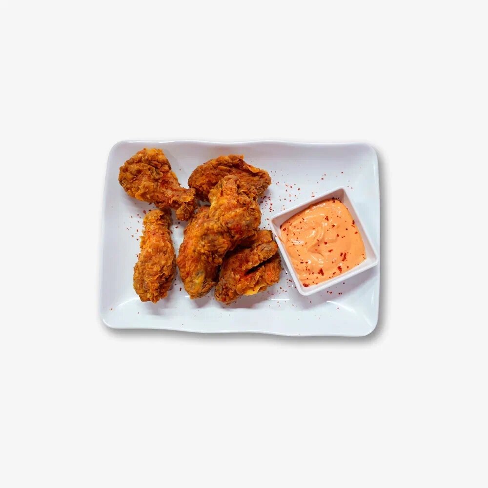 Алтын түстес қытырлақ қабыққа дейін қуырылған, фирмалық Дапанджи соусымен сіңдірілген жұмсақ тауық қанаттары.