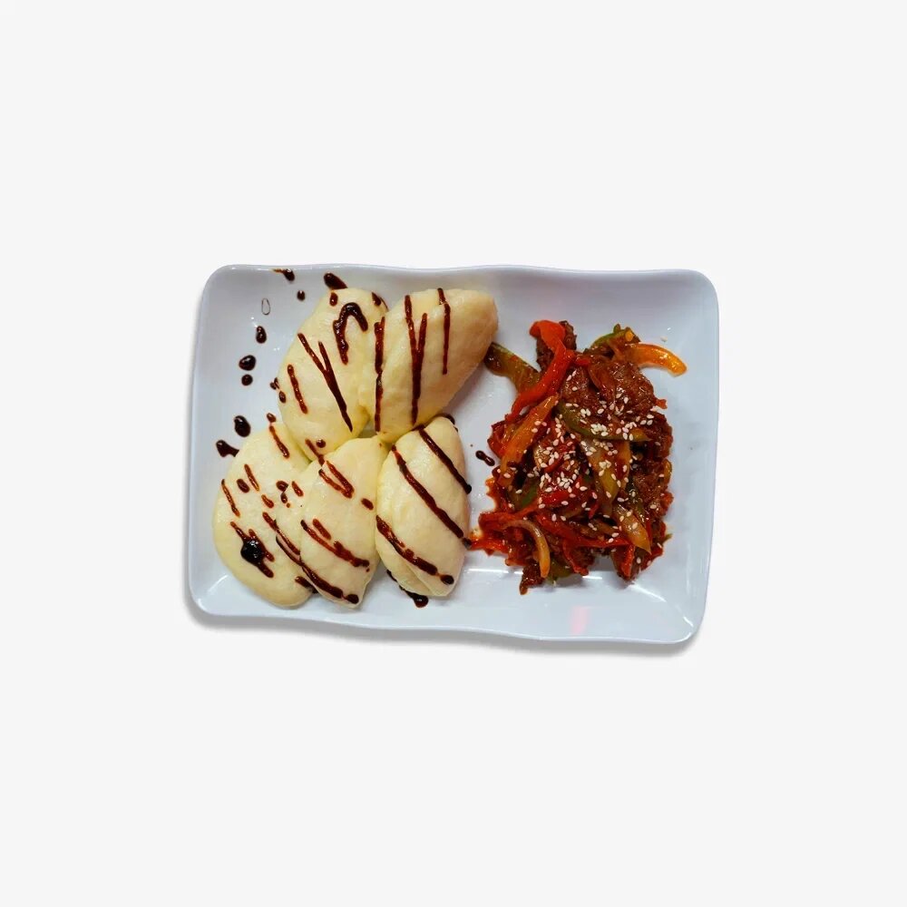 Шырынды ет салмасы бар жұмсақ буға піскен пампушка.
