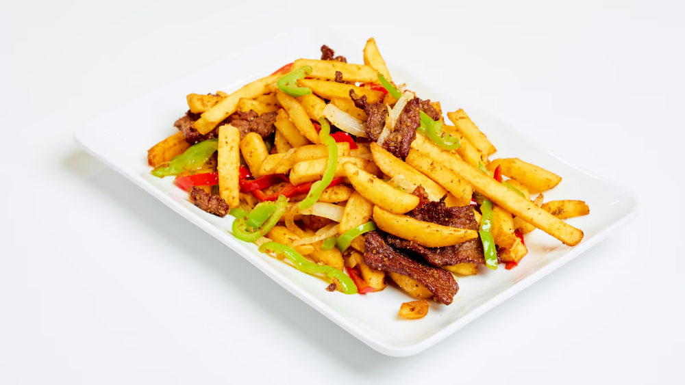 Қытырлақ картоп фри қуырылған ет, пияз және бұрышпен бірге.